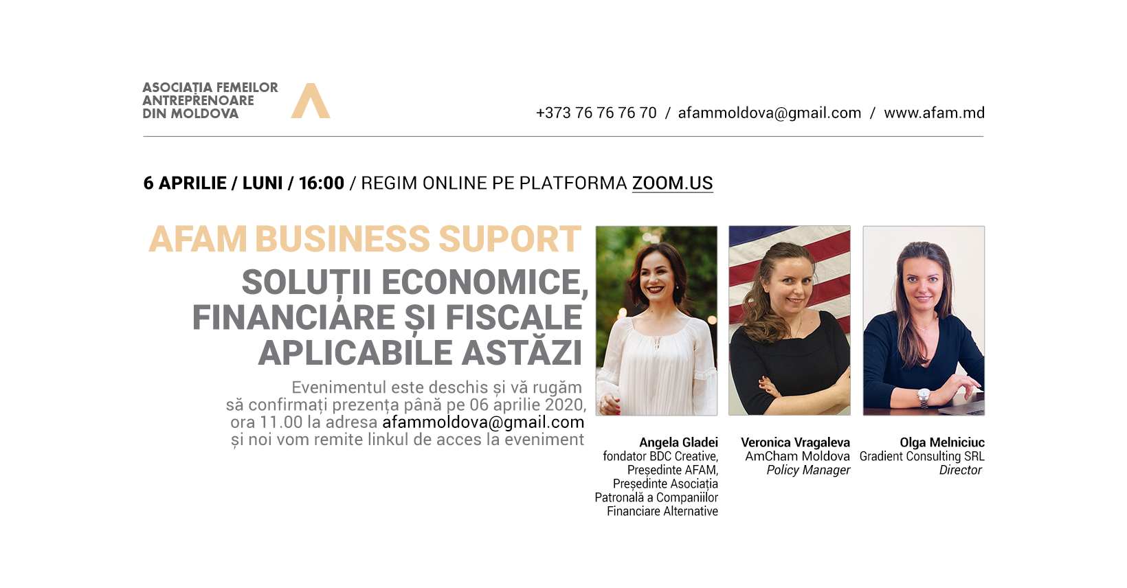 Vă comunicăm că, cel de-al 3-lea eveniment AFAM Business Suport: Soluții economice, financiare și fiscale astăzi va avea loc Luni, 06 aprilie, ora 16.00, cu participarea doamnei Angela Gladei, fondator BDC Creative, Președinte AFAM, Președinte Asociația Patronală a Companiilor Financiare Alternative, doamnei Veronica Vragaleva, Policy Manager al AmCham Moldova și doamnei Olga Melniciuc, Director Gradient Consulting SRL, în regim online pe platforma zoom.us.