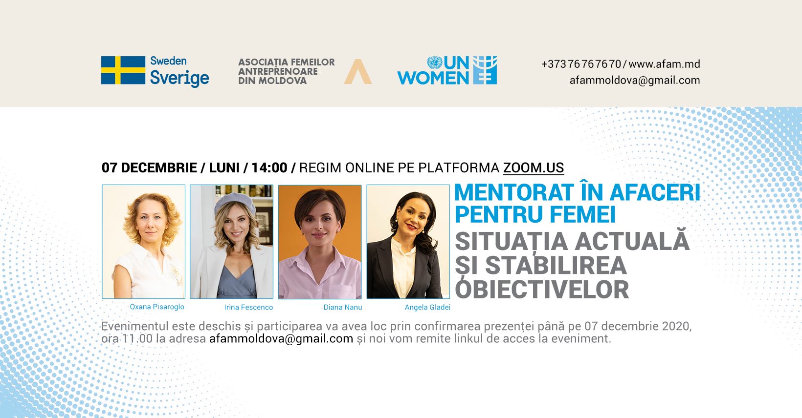 Programul de mentorat în afaceri pentru femei este implementat de către Asociația Femeilor Antreprenoare din Moldova cu susținerea oferită de UN Women în Moldova și suportul financiar al Suediei, fiind destinat femeilor din întreaga țară care dețin o afacere, sau sunt în poziție de manager, și au înfruntat greutăți din cauza pandemiei.