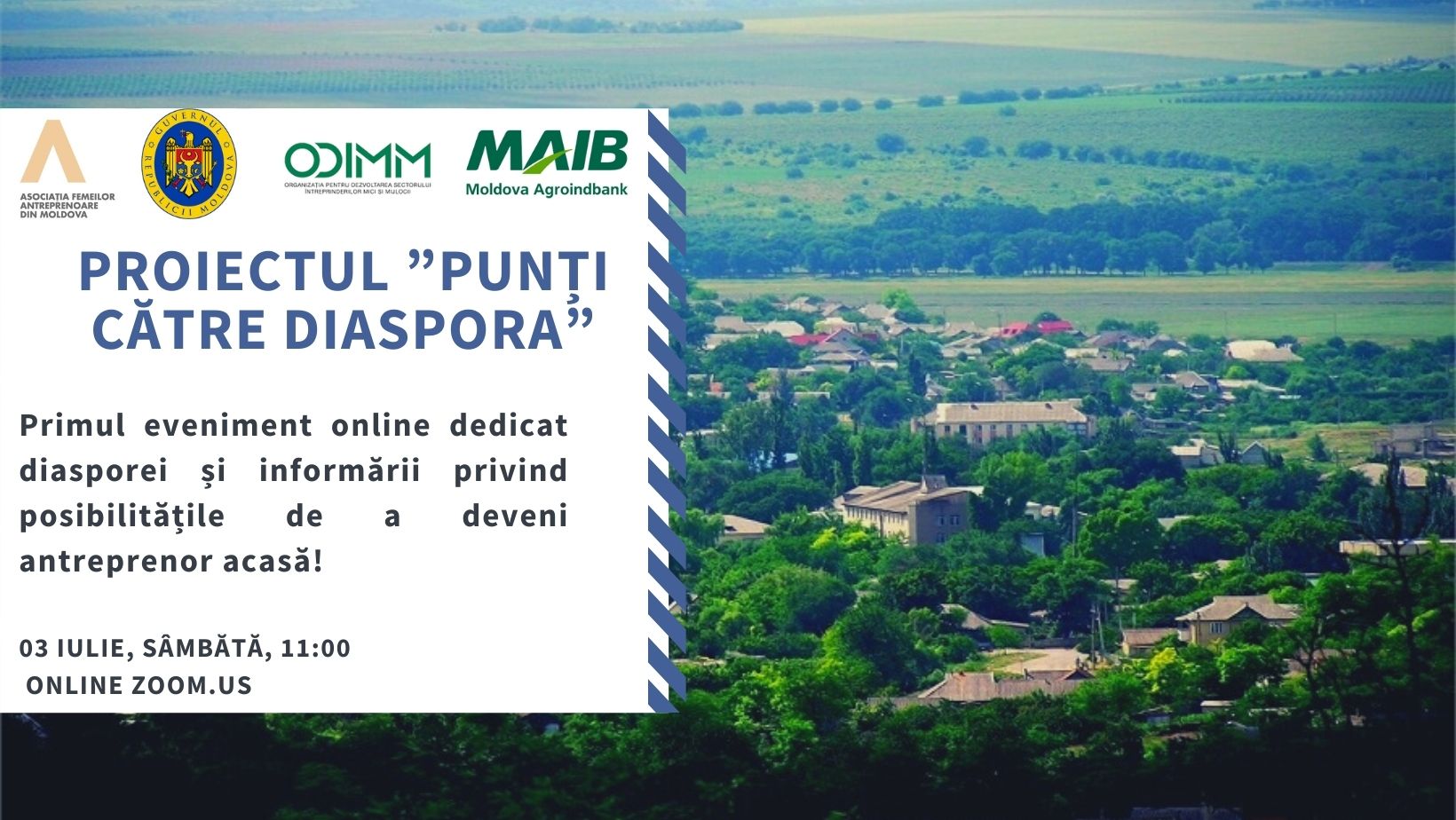 Proiectul va debuta cu primul eveniment online dedicat diasporei și informării privind posibilitățile de a deveni antreprenor acasă, care va avea loc la 03 iulie, ora 11:00, cu următorii speakeri