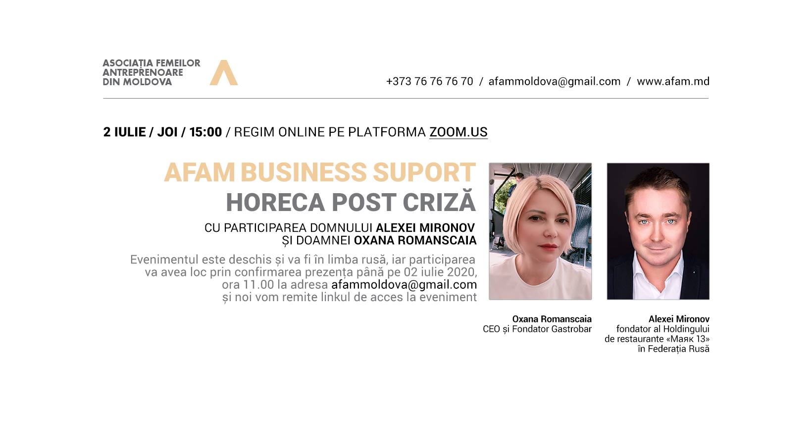Ne dorim sa știți că suntem alături de voi în această perioadă deosebit de dificilă și vrem să vă susținem prin organizarea evenimentului AFAM Business Suport: HoReCa post criză, care va avea loc Joi, 02 iulie, ora 15.00 cu participarea domnului Alexei Mironov, fondator al holdingului de restaurante «Маяк 13».în Federația Rusă și doamnei Oxana Romanscaia, CEO și Fondator Gastrobar, în regim online pe platforma zoom.us.