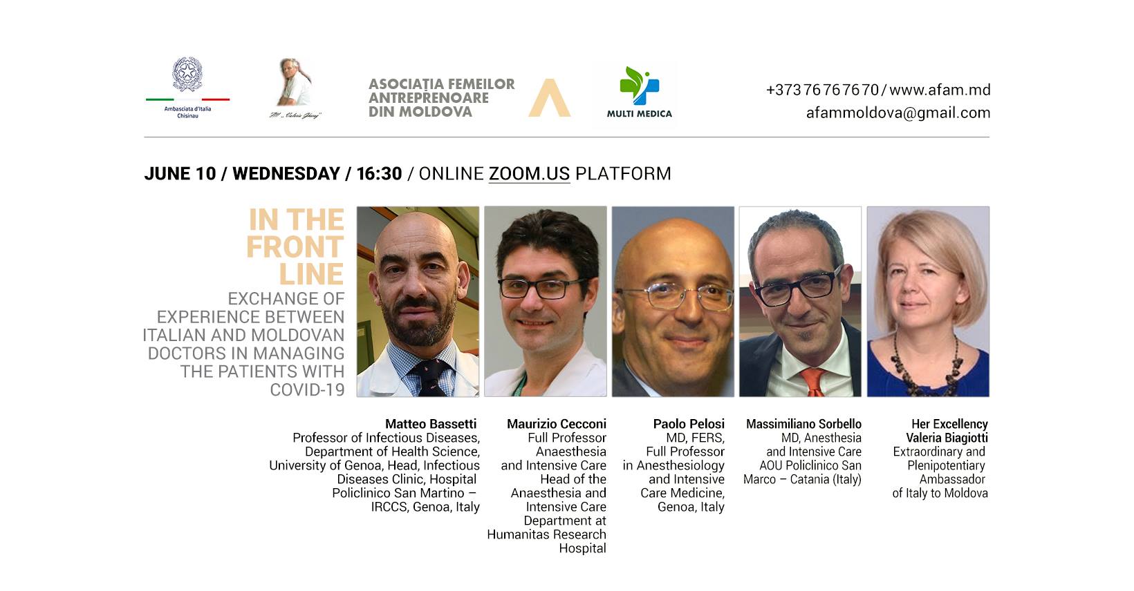 In the context of the fight against the coronavirus pandemic, the Italian Embassy in the Republic of Moldova and Her Excellency Valeria Biagiotii launched the initiative to organise an international event named „IN THE FRONT LINE – exchange of experience between Italian and Moldovan doctors in managing the patient with COVID-19”, implemented with the support of the „MULTI MEDICA” Medical Center, „Valeriu Ghereg” Medical Foundation and Association of Women Entrepreneurs from Moldova (AFAM).