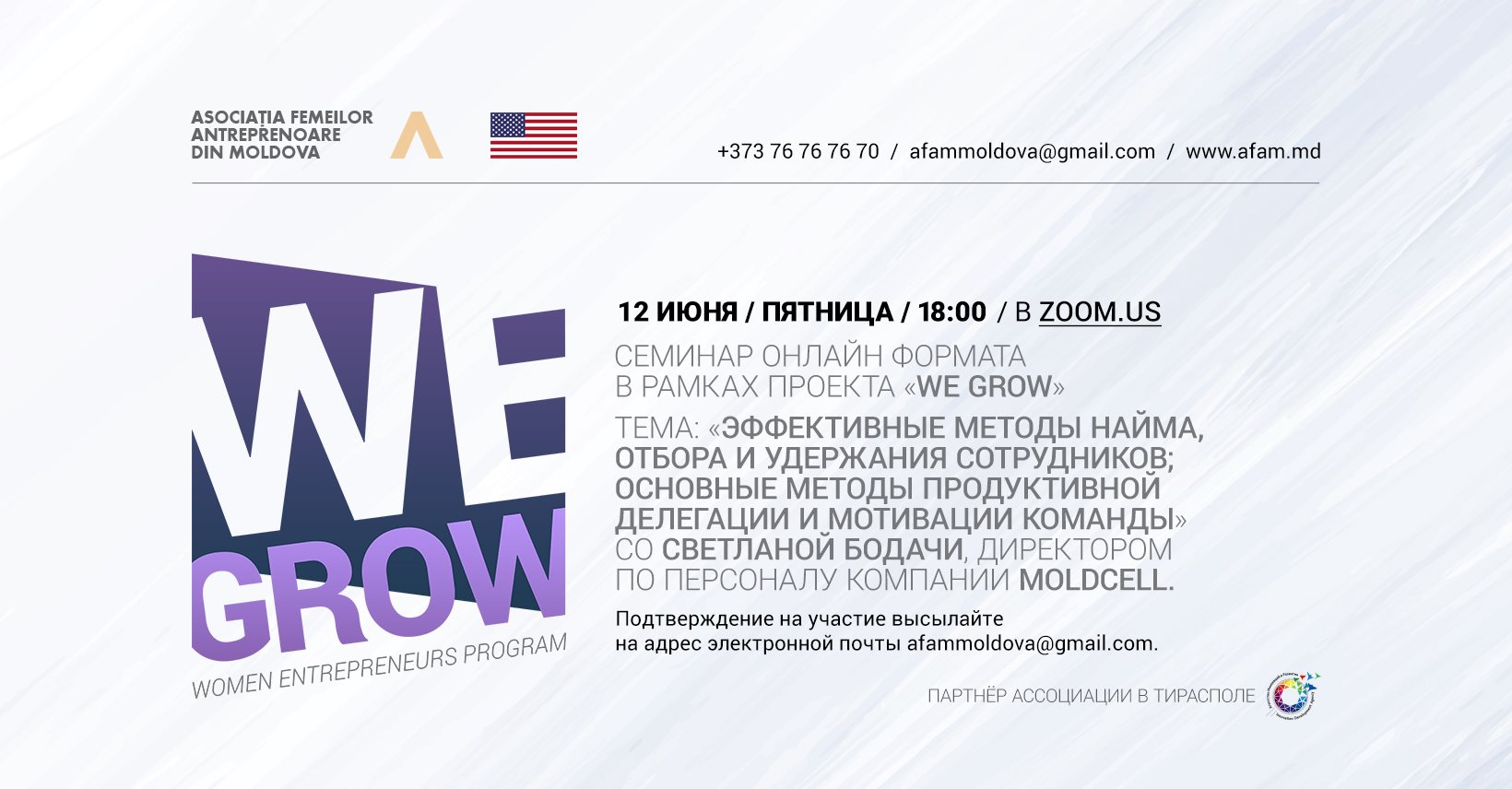 Evenimentul este organizat vineri, 12.06.20, ora 18.00, în cadrul proiectului We Grow, cu susținerea financiară a Ambasadei SUA și realizat de către Svetlana Bodaci, Director resurse umane a companiei Moldcell, fiind livrat în limba rusă.