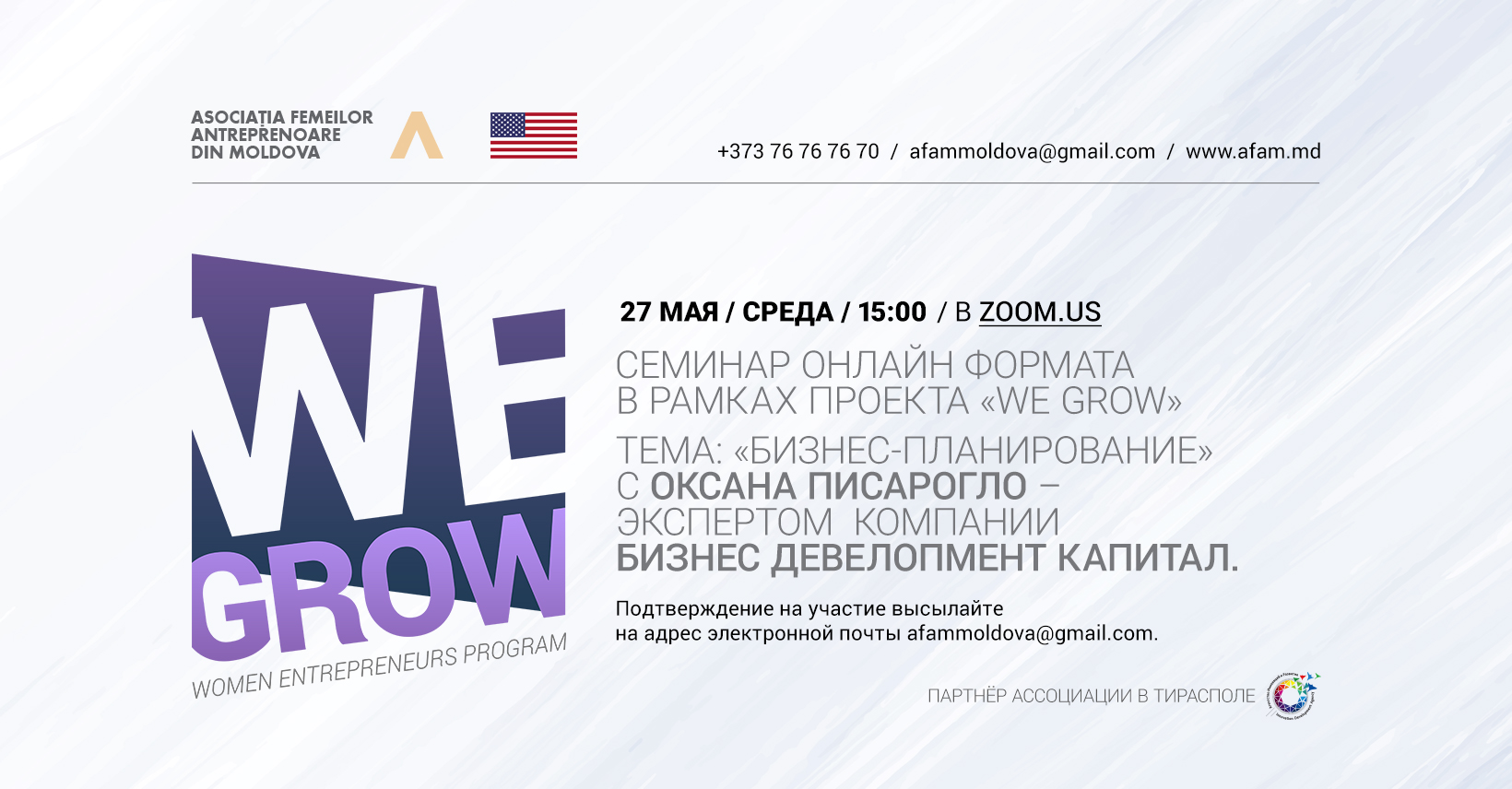Continuăm instruirile în cadrul proiectulu WE Grow, susținut de către USAID Moldova și următorul eveniment va avea loc mâine, 27.05.2020, ora 15.00, cu genericul ”Planificarea afacerii”.
