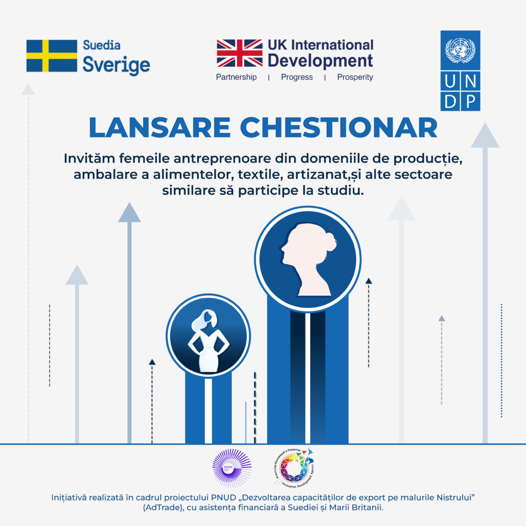 Invităm femeile antreprenoare din domeniile de producție, ambalare a alimentelor, textile, artizanat și alte sectoare similare să participe la un studiu. Colectarea datelor face parte dintr-o inițiativă care are drept scop identificarea provocărilor, oportunităților și nevoilor femeilor antreprenoare, pentru a contribui la dezvoltarea unor politici și intervenții mai eficiente.